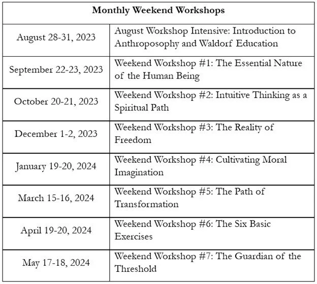 The workshops below offer an introductory exploration of the Anthroposophical worldview, Steiner’s picture of the human being and child development, Waldorf education and its evolving curriculum and teaching methods, as well as the path of the teacher for today and well into the future.